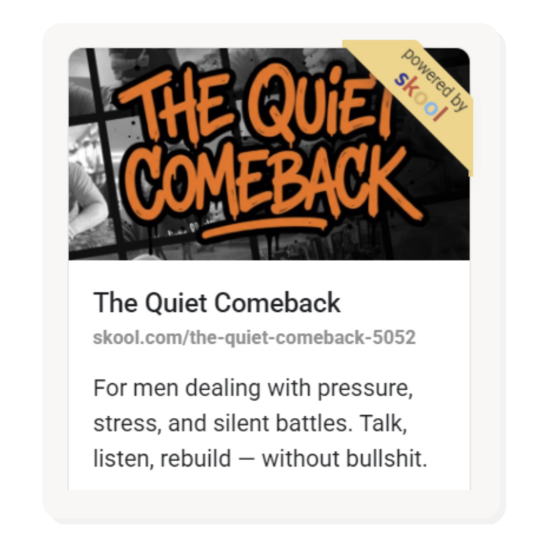 The Quiet Comeback is a private space for men dealing with pressure, stress, and the stuff that doesn’t always get said out loud. It’s about honest conversations, shared experience, and getting yourself back on solid ground without posturing, clichés, or bullshit. You don’t have to have it all figured out to be here, just be willing to show up.